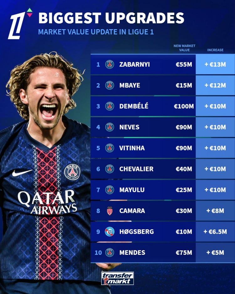 具体来看,扎巴尔尼的身价现在提升到了5500万欧元,展现了他在球场上的出色表现和潜力。紧随其后的是姆巴耶,他的身价也上涨了1200万欧元,现已达到1500万欧元,这个上升势头无疑反映了他在球队中的重要性。
