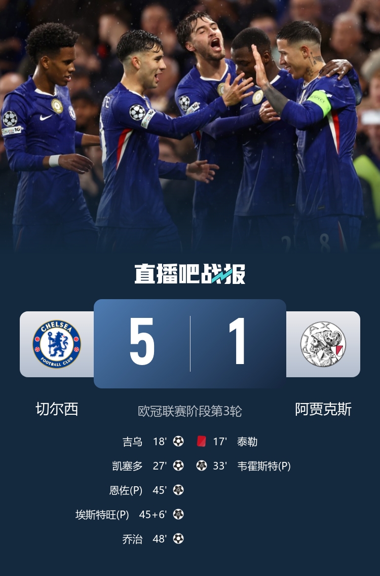切尔西以五比一战胜十人阿贾克斯 取得四连胜 恩佐和埃斯特旺点球破门 凯塞多也有建树_欧冠直播在线直播观看