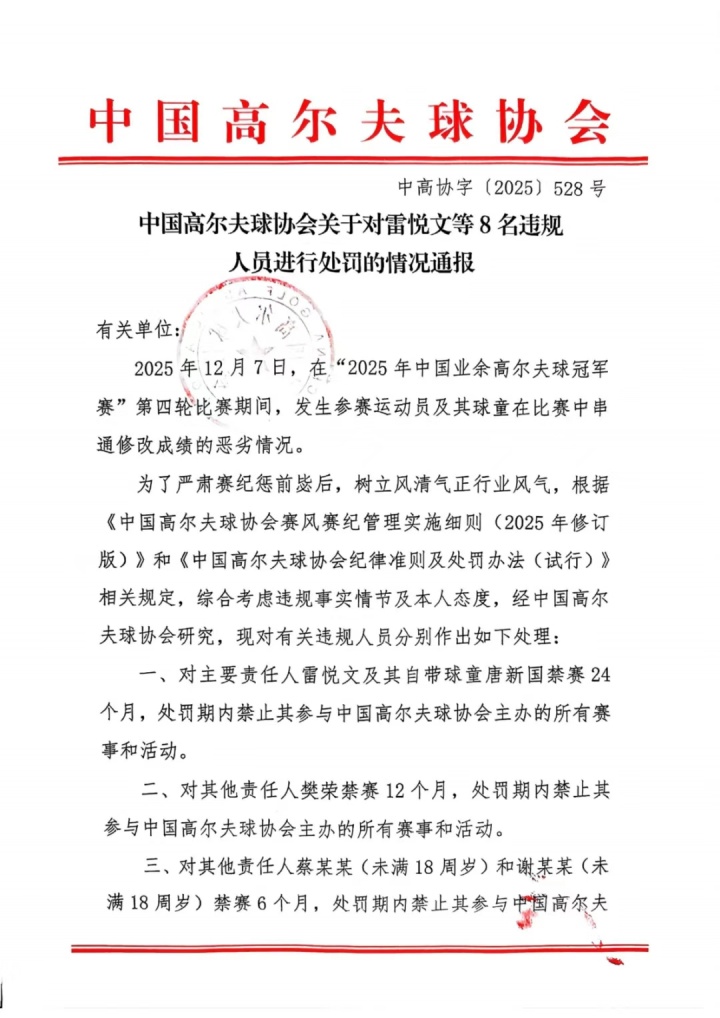 12月19日,中国高尔夫球协会发布了一则关于“2025年中国业余高尔夫球冠军赛”中的严重违规行为的通报。在12月7日的比赛第四轮中,有参赛运动员及其球童涉嫌串通修改比赛成绩,这一行为严重违背了比赛诚信原则。
