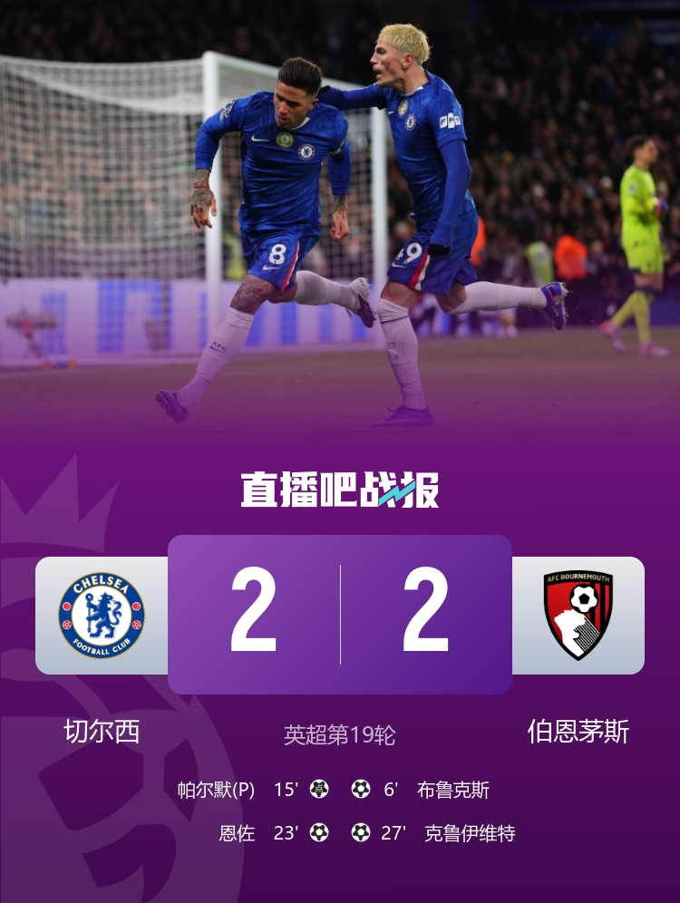 切尔西与伯恩茅斯战成平局 伯恩茅斯连续十轮未尝胜绩帕尔默罚入点球恩佐轻松破门_英超直播