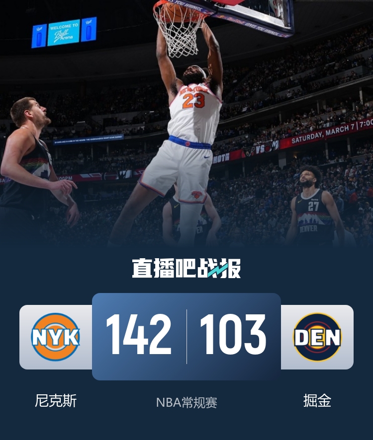 再次上场,约基奇继续发挥,其强悍的得分表现接连制造积分,但尼克斯在场上的优势愈发明显,状态持续火热,逐步扩大领先。如果说第一节是激情四射的对抗,第三节则是尼克斯一骑绝尘的乐章,毫不给掘金反击的机会,随着时间的推移,场上的差距愈加明显。最终,尼克斯以142-103的悬殊比分战胜掘金,带着胜利的喜悦客场凯旋。
