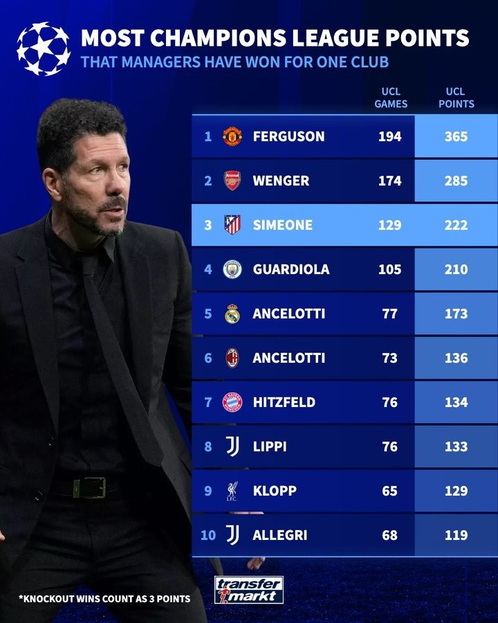 单一俱乐部欧冠积分榜执教记录:弗格森365分 温格285分 西蒙尼222分_西甲直播
