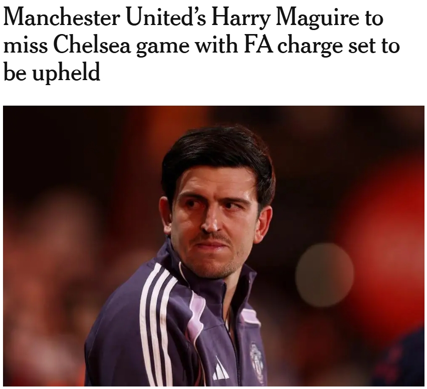 英足总此前已正式宣布,针对3月20日曼联与伯恩茅斯的比赛,马奎尔因辱骂第四官员而遭到控告。官方公告指出:“在这场英超联赛中,马奎尔于第78分钟因在禁区内拉倒了单刀突入的埃瓦尼尔森被判罚红牌,随后他被指责在被罚下后表现不当,使用了侮辱性言辞对待第四官员。马奎尔需在4月2日之前对此做出回应。”